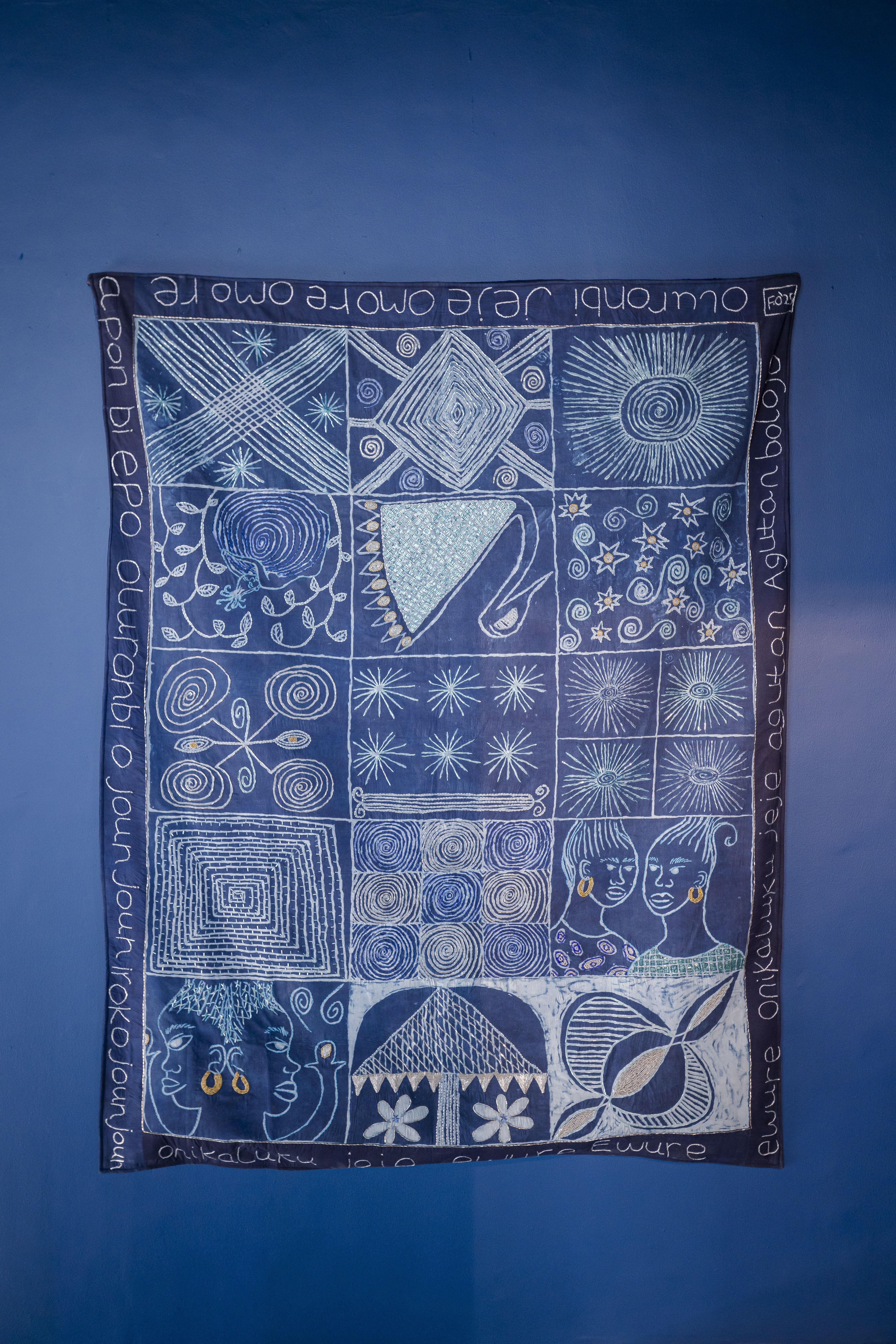 Hand-embroidered and beaded Adire quilt